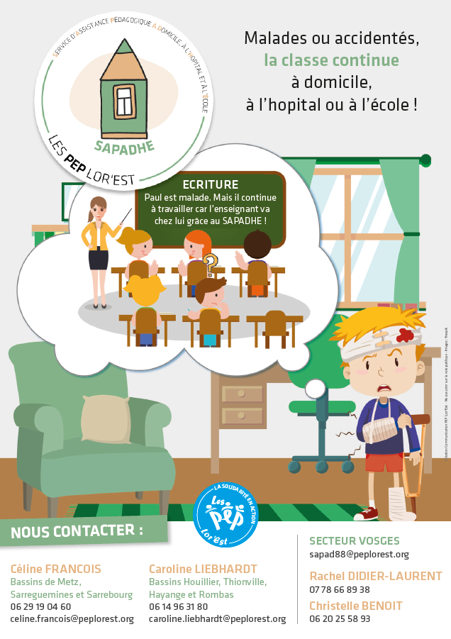 Le SAPADHE (Service d’Assistance Pédagogique à Domicile, à l’Hôpital ou à l’École) permet aux élèves dont la scolarité est interrompue pour maladie, accident ou troubles de santé prolongés de poursuivre les apprentissages essentiels et de préparer un retour en classe sans retard. Ce service est mis en place par les PEP Lor’Est en partenariat avec la Direction des Services Départementaux de l’Éducation Nationale.